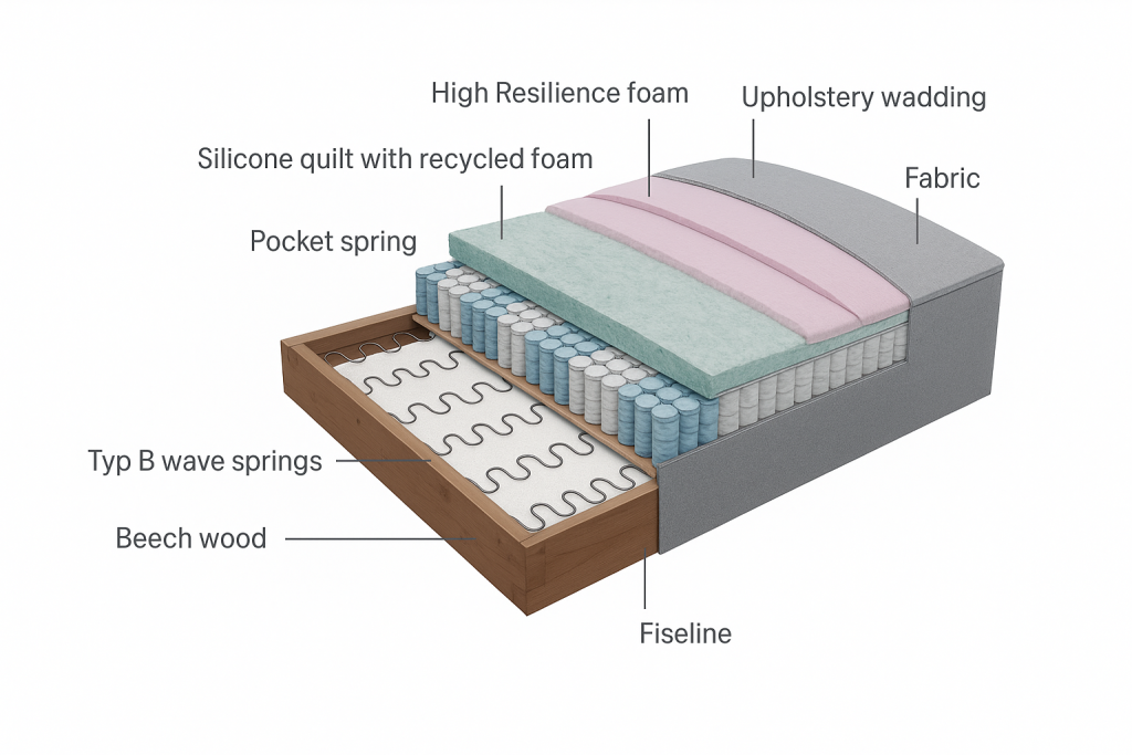 HR pjena i silikonska vlakna: Iznad opruga nalazi se sloj visokoelastične HR pjene za trajnu potporu bez ulijeganja, dok završni sloj od mekih silikonskih vlakana daje onaj luksuzni, “oblakasti” osjećaj mekoće na prvi dodir.